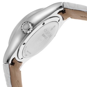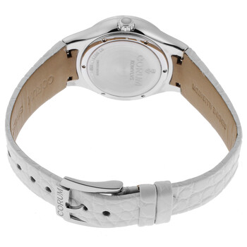 White gold case with a white crocodile leather strap. Fixed set with diamonds bezel. Mother of pearl dial with diamonds hour markers. Quartz movement. Case diameter: 31mm. Round case shape. Pin buckle clasp. Functions: hour, minute. Luxury watch style. Corum Romvlvs Mother Of Pearl Dial White Gold Ladies Watch 024.131.69/0009 PN34.