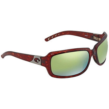 Costa Del Mar Sunglasses. Series ISABELA. Series number: IB 10. Color code: OGMP. Size: 63.5. Shape: Rectangular. Lens Width: 63.8 mm. Lens Height: 39.9 mm. Lens Bridge: 16 mm. Arm Length: 120 mm. 100% UV Protection. Polarized. Frame Material: Bio Resin. Frame Color: Tortoise. Lenses Type: Green Mirror Polarized Polycarbonate. Rim Style: Full-Rim. UPC/EAN code: 097963516402. Costa Del Mar ISABELA Green Mirror Polarized Polycarbonate Ladies Sunglasses IB 10 OGMP 64.