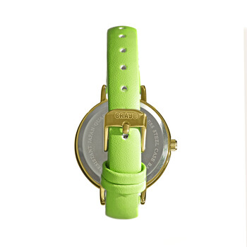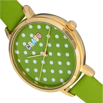 Gold-tone alloy case with a green leather strap. Fixed gold-tone alloy bezel. Green dial with gold-tone stick-shaped hands. No markers. Dial Type: Analog. Quartz movement. Scratch resistant mineral crystal. Pull / push crown. Solid case back. Round case shape. Case size: 35 mm. Case thickness: 9 mm. Band width: 12 mm, band length: 7.75 inches. Tang clasp. Water resistant at 30 meters / 100 feet. Functions: hour, minute, second. Dot Series. Casual watch style. Watch label: Japan Movt. Crayo Dot Quartz Green Dial Unisex Watch CRACR5903.