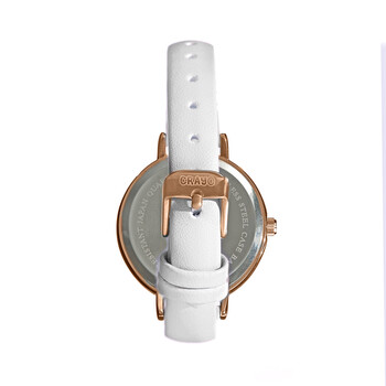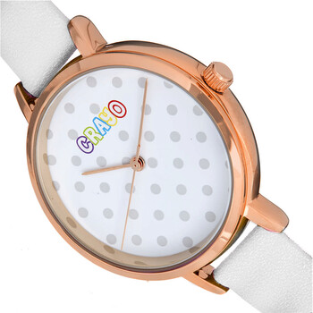 Rose gold-tone alloy case with a white leather strap. Fixed rose gold-tone alloy bezel. White dial with rose gold-tone stick-shaped hands. No markers. Dial Type: Analog. Quartz movement. Scratch resistant mineral crystal. Pull / push crown. Solid case back. Round case shape. Case size: 35 mm. Case thickness: 9 mm. Band width: 12 mm. Band length: 7.75 inches. Tang clasp. Water resistant at 30 meters / 100 feet. Functions: hour, minute, second. Dot Series. Casual watch style. Watch label: Japan Movt. Crayo Dot Quartz White Dial Unisex Watch CRACR5905.