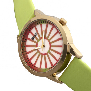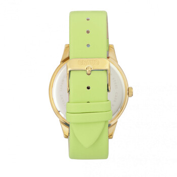 Gold-tone alloy case with a light green leather strap. Fixed gold alloy bezel. Multicolor dial with gold-tone hands and index hour markers. Dial Type: Analog. Luminescent hands. Quartz movement. Scratch resistant mineral crystal. Pull / push crown. Solid case back. Round case shape, case size: 41 mm, case thickness: 10 mm. Band width: 20 mm. Buckle clasp. Water resistant at 30 meters / 100 feet. Functions: hour, minute, second. Casual watch style. Watch label: Japan Movt. Crayo Electric Watch CRACR5003.