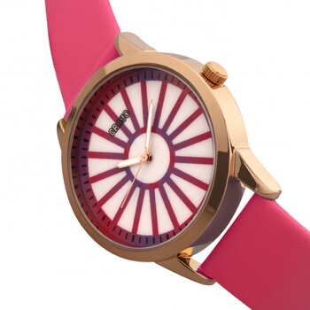 Rose gold-tone alloy case with a hot pink leather strap. Fixed rose gold-tone alloy bezel. Multicolor dial with gold-tone hands and index hour markers. Minute markers around the outer rim. Dial Type: Analog. Luminescent hands. Quartz movement. Scratch resistant mineral crystal. Pull / push crown. Solid case back. Round case shape, case size: 41 mm, case thickness: 10 mm. Band width: 20 mm. Buckle clasp. Water resistant at 30 meters / 100 feet. Functions: hour, minute, second. Casual watch style. Watch label: Japan Movt. Crayo Electric Watch CRACR5004.
