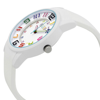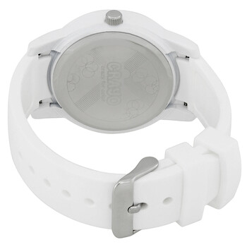 White rubber-coated metal case with a white silicone strap. Fixed white rubber-coated metal bezel. White dial with luminous green and red hands and multi-colored (3D raised) Arabic numeral hour markers. Arabic numeral minute markers (at 5 minute intervals). Minute markers around an inner ring. Dial Type: Analog. Luminescent hands and markers. Date display at the 3 o'clock position. Quartz movement. Scratch resistant mineral crystal. Pull / push crown. Solid case back. Case diameter: 41 mm. Case thickness: 11 mm. Round case shape. Band width: 17 mm. Tang clasp. Water resistant at 20 meters / 66 feet. Functions: date, hour, minute, second. Casual watch style. Crayo Festival White Dial White Silicone Unisex Watch CR2001.