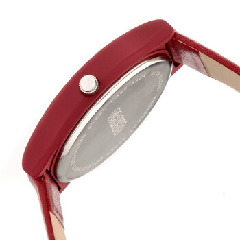 Red rubber-coated metal case with a red leatherette strap. Fixed red rubber-coated metal bezel. Red (blue center) dial with silver-tone hands and Arabic numeral hour markers. Dial Type: Analog. Quartz movement. Scratch resistant mineral crystal. Solid case back. Round case shape. Case size: 36 mm. Case thickness: 9 mm. Band width: 20 mm. Tang clasp. Water resistant at 30 meters / 100 feet. Functions: hour, minute, second. Jubilee Series. Casual watch style. Watch label: Japan Movt. Crayo Jubilee Blue Dial Red Leatherette Watch CRACR4603.