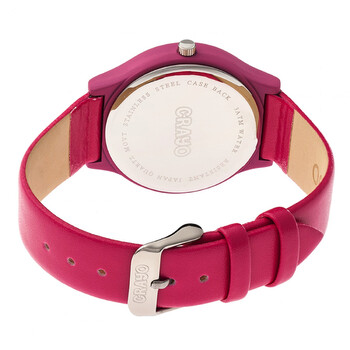 Hot pink stainless steel case with a hot pink leatherette strap. Fixed hot pink metal bezel. Blue dial with silver-tone hands and Arabic numeral hour markers. Dial Type: Analog. Quartz movement. Scratch resistant mineral crystal. Pull / push crown. Solid case back. Round case shape, case size: 36 mm, case thickness: 9 mm. Band width: 20 mm. Buckle clasp. Water resistant at 30 meters / 100 feet. Functions: hour, minute, second. Casual watch style. Watch label: Japan Movt. Crayo Jubilee Blue Dial Watch CRACR4607.
