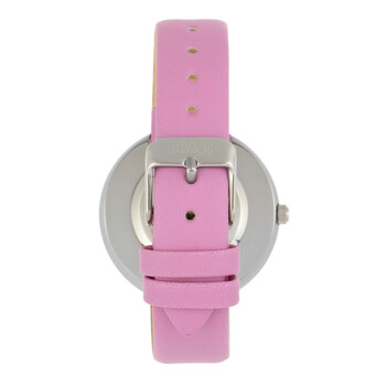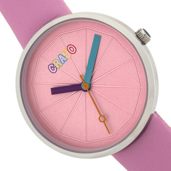 Silver-tone alloy case with a pink leatherette strap. Fixed silver-tone alloy bezel. Pink dial with blue and purple hands. No markers. Dial Type: Analog. Quartz movement. Scratch resistant mineral crystal. Pull / push crown. Solid case back. Round case shape. Case size: 38 mm. Case thickness: 9 mm. Band width: 16 mm. Band length: 8 inches. Tang clasp. Water resistant at 30 meters / 100 feet. Functions: hour, minute, second. Metric Series. Casual watch style. Crayo Metric Quartz Pink Dial Unisex Watch CRACR5804.