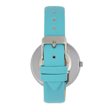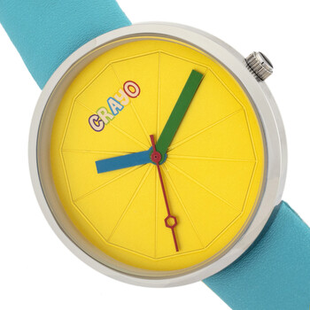 Silver-tone alloy case with a blue leatherette strap. Fixed silver-tone alloy bezel. Yellow dial with green and blue hands. No markers. Dial Type: Analog. Quartz movement. Scratch resistant mineral crystal. Pull / push crown. Solid case back. Round case shape. Case size: 38 mm. Case thickness: 9 mm. Band width: 16 mm, band length: 8 inches. Tang clasp. Water resistant at 30 meters / 100 feet. Functions: hour, minute, second. Metric Series. Casual watch style. Crayo Metric Quartz Yellow Dial Unisex Watch CRACR5806.