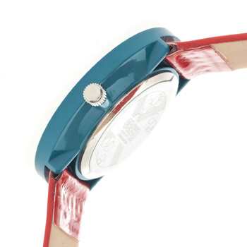 Teal metal case with a red (beige back) polyurethane strap. Fixed teal metal bezel showing Roman numeral hour markers. Silver dial with silver-tone hands and dot hour markers. Dial Type: Analog. Quartz movement. Scratch resistant mineral crystal. Pull / push crown. Solid case back. Round case shape. Case size: 37 mm. Case thickness: 8 mm. Band width: 18 mm. Tang clasp. Water resistant at 30 meters / 100 feet. Functions: hour, minute, second. Prestige Series. Casual watch style. Crayo Prestige Silver Dial Red Polyurethane Watch CRACR3107.