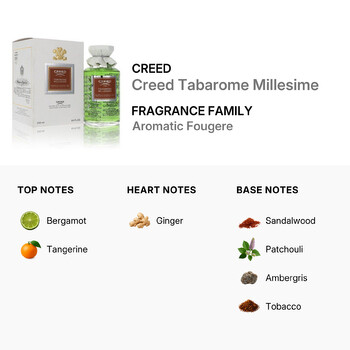 Creed Tabarome Millesime belongs to the Aromatic Fougere fragrance family, known for its fresh yet complex character. It opens with a crisp burst of bergamot and juicy tangerine, setting a confident and refreshing tone. At its heart lies the warm spice of ginger, adding a sharp, invigorating edge that energizes your senses. The base notes reveal a rich blend of sandalwood, patchouli, ambergris, tobacco, and leather—delivering a deep, masculine finish that is both smooth and powerful.