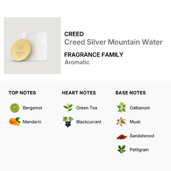 Part of the Aromatic fragrance family, Creed Silver Mountain Water opens with the bright and zesty top notes of bergamot and mandarin. As the scent develops, it reveals a heart of soothing green tea and juicy blackcurrant, creating a balanced and refreshing blend. The base notes of galbanum, musk, sandalwood, and petitgrain provide a soft and earthy finish, grounding the fragrance with warmth and elegance.