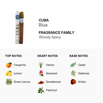 Cuba Blue opens with a crisp burst of tangerine, lemon, and green leaves, giving it a fresh and energizing start. As the scent develops, rich heart notes of vetiver, geranium, sandalwood, and patchouli add depth and warmth. A base of cedar, oakmoss, and amber grounds the fragrance with a smooth, masculine finish that lasts all day.