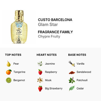 Glam Star by Custo Barcelona is available in a 3.3 oz EDT spray and is shipped exclusively within the Contiguous United States and Canada. Step into the spotlight and let your inner star shine with Glam Star—because true glamour never goes unnoticed.