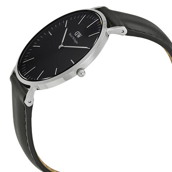Stainless steel case with a black (croco-embossed) leather strap. Fixed stainless steel bezel. Black dial with silver-tone hands and index hour markers. Minute markers around the outer rim. Dial Type: Analog. Quartz movement. Scratch resistant mineral crystal. Pull / push crown. Solid case back. Case size: 40 mm. Case thickness: 6 mm. Round case shape. Band width: 20 mm. Tang clasp. Water resistant at 30 meters / 100 feet. Functions: hour, minute. Additional Info: in general, withstands splashes or brief immersion in water, but not suitable for swimming or bathing. Casual watch style. Daniel Wellington Classic Black Sheffield 40mm Watch DW00100133.