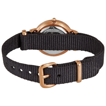 Rose gold-tone stainless steel case with a black fabric strap. Fixed rose gold-tone bezel. Black dial with rose gold-tone hands and index hour markers. Dial Type: Analog. Quartz movement. Scratch resistant mineral crystal. Pull / push crown. Solid case back. Round case shape. Case size: 28 mm. Case thickness: 6 mm. Band width: 12 mm. Tang clasp. Water resistant at 30 meters / 100 feet. Functions: hour, minute. Casual watch style. Watch label: Japan Movt. Daniel Wellington Classic Petite Black Cornwall Ladies Watch Dw00100247.