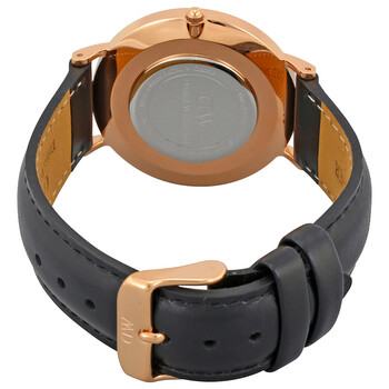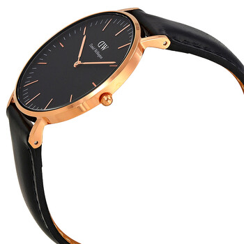 Rose gold-tone stainless steel case with a black leather strap. Fixed rose gold-tone bezel. Black dial with rose gold-tone hands and index hour markers. Minute markers around the outer rim. Dial Type: Analog. Quartz movement. Scratch resistant mineral crystal. Pull / push crown. Solid case back. Case size: 36 mm. Case thickness: 6 mm. Round case shape. Band width: 18 mm. Tang clasp. Water resistant at 30 meters / 100 feet. Functions: hour, minute. Casual watch style. Daniel Wellington Classic Sheffield Black Dial 36MM Watch DW00100139.