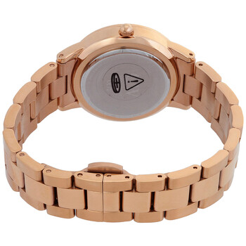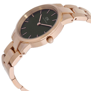 Rose gold-tone stainless steel case and bracelet. Fixed rose gold-tone stainless steel bezel. Black dial with rose gold-tone hands and index hour markers. Dial Type: Analog. Quartz movement. Scratch resistant mineral crystal. Pull / push crown. Solid case back. Round case shape, case size: 32 mm, case thickness: 9 mm. Band width: 14 mm. Deployment clasp. Water resistant at 30 meters / 100 feet. Functions: hour, minute. Iconic Link Series. Casual watch style. Watch label: Japan Movt. Daniel Wellington Iconic Link Quartz Black Dial Ladies Watch DW00100212.