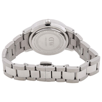 Silver-tone stainless steel case and bracelet. Fixed silver-tone stainless steel bezel. Black dial with silver-tone hands and index hour markers. Dial Type: Analog. Quartz movement. Scratch resistant mineral crystal. Pull / push crown. Solid case back. Round case shape, case size: 36 mm, case thickness: 10 mm. Band width: 14 mm. Butterfly clasp. Water resistant at 30 meters / 100 feet. Functions: hour, minute. Iconic Link Series. Casual watch style. Watch label: Japan Movt. Daniel Wellington Iconic Link Quartz Black Dial Unisex Watch DW00100204.