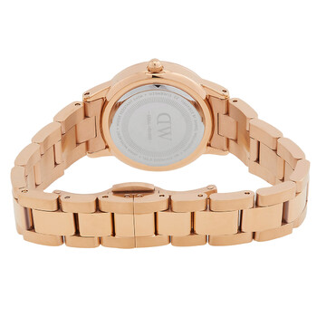 Rose gold-tone stainless steel case and bracelet. Fixed rose gold-tone stainless steel bezel. White dial with rose gold-tone hands and index hour markers. Dial Type: Analog. Quartz movement. Scratch resistant mineral crystal. Pull / push crown. Round case shape, case size: 28 mm, case thickness: 8 mm. Band width: 14 mm. Deployment with push button release clasp. Water resistant at 30 meters / 100 feet. Functions: hour, minute. Iconic Link Series. Casual watch style. Watch label: Japan Movt. Daniel Wellington Iconic Link Quartz White Dial Ladies Watch DW00100213.