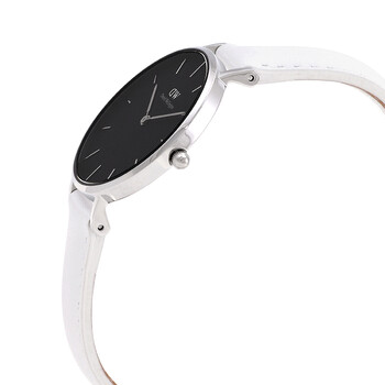 Stainless steel case with a white leather strap. Fixed stainless steel bezel. Black dial with silver-tone hands and index hour markers. Dial Type: Analog. Quartz movement. Scratch resistant mineral crystal. Pull / push crown. Solid case back. Round case shape. Case size: 32 mm. Case thickness: 6 mm. Band width: 14 mm. Band length: 7.3 inches. Tang clasp. Water resistant at 30 meters / 100 feet. Functions: hour, minute. Petite Bondi Series. Casual watch style. Watch label: Japan Movt. Daniel Wellington Petite Bondi Quartz Black Dial Ladies Watch DW00100284.