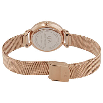 Rose gold-tone stainless steel case with a rose gold-tone stainless steel mesh bracelet. Fixed rose gold-tone stainless steel bezel. Black dial with rose gold-tone hands and index hour markers. Dial Type: Analog. Quartz movement. Scratch resistant mineral crystal. Pull / push crown. Solid case back. Round case shape, case size: 28 mm, case thickness: 6 mm. Band width: 12 mm, band length: 150 mm / 205 mm. Fold over slip through clasp. Water resistant at 30 meters / 100 feet. Functions: hour, minute. Petite Melrose Series. Casual watch style. Daniel Wellington Petite Melrose Quartz Black Dial Ladies Watch DW00100217.