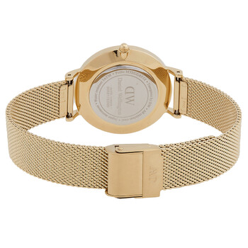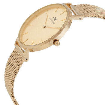 Yellow gold-tone stainless steel case and bracelet. Fixed yellow gold-tone stainless steel bezel. Gold-tone dial with yellow gold-tone hands and index hour markers. Dial Type: Analog. Quartz movement. Scratch resistant mineral crystal. Pull / push crown. Round case shape, case size: 32 mm, case thickness: 6 mm. Band width: 14 mm. Deployment with push button release clasp. Water resistant at 30 meters / 100 feet. Functions: hour, minute. Petite Series. Casual watch style. Watch label: Japan Movt. Daniel Wellington Petite Quartz Gold Dial Ladies Watch DW00100474.