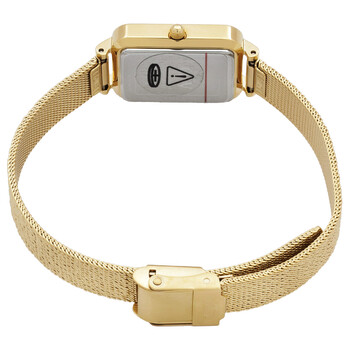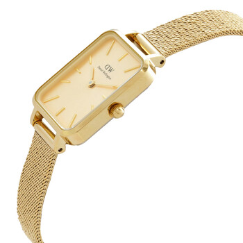Gold-tone stainless steel case with a gold-tone stainless steel mesh bracelet. Fixed gold-tone stainless steel bezel. Gold-tone dial with gold-tone hands and index hour markers. Dial Type: Analog. Quartz movement. Scratch resistant mineral crystal. Pull / push crown. Solid case back. Rectangle case shape, case size: 20 x 26 mm. Band width: 10 mm. Water resistant at 30 meters / 100 feet. Functions: hour, minute. Quadro Series. Casual watch style. Watch label: Japan Movt. Daniel Wellington Quadro Quartz Gold Dial Ladies Watch DW00100485.