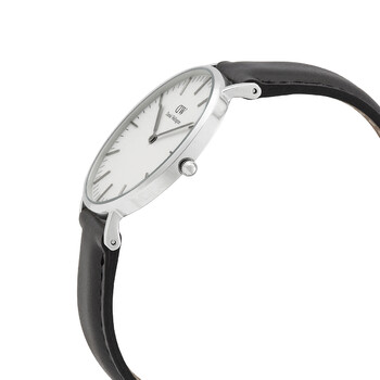 Silver-tone stainless steel case with a black leather strap. Fixed silver-tone stainless steel bezel. White dial with silver-tone hands and index hour markers. Dial Type: Analog. Quartz movement. Scratch resistant mineral crystal. Pull / push crown. Solid case back. Case size: 36 mm. Case thickness: 6 mm. Round case shape. Fold over with safety release clasp. Water resistant at 30 meters / 100 feet. Functions: hour, minute. Casual watch style. Daniel Wellington Sheffield White Dial Ladies Leather Watch DW00100053.