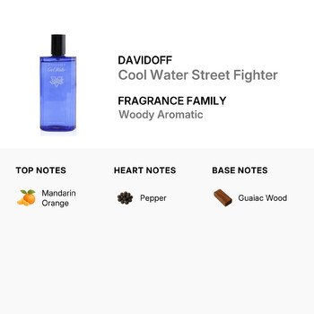 Davidoff Cool Water Street Fighter opens with a zesty burst of mandarin orange, giving it a lively and fruity start. As the scent develops, a spicy heart of pepper adds a touch of heat and excitement. Finally, the base note of guaiac wood brings a rich, warm, and slightly powdery finish, grounding the fragrance with a masculine edge. This unique mix makes it perfect for daytime wear, especially during warmer seasons when freshness matters most.