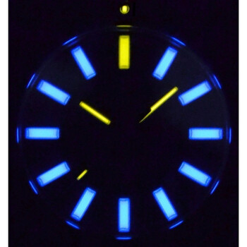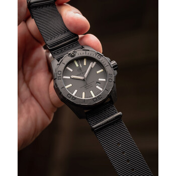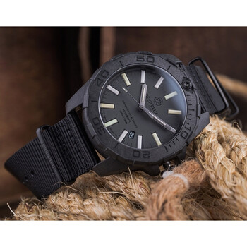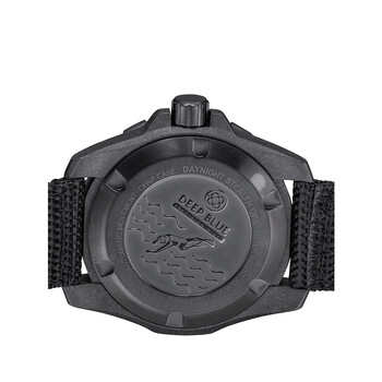 Black polycarbonate case with a black nylon strap. Uni-directional rotating black polycarbonate bezel. Grey dial with black hands and index hour markers. Minute markers around the outer rim. Dial Type: Analog. Luminescent hands and markers. Between the 4 and 5 o'clock position. SII Caliber NH35A Automatic movement, containing 24 Jewels, bitting at 21600 vph, and has a power reserve of approximately 41 hours. Scratch resistant sapphire crystal. Screw down crown. Solid case back. Round case shape, case size: 44 mm, case thickness: 14 mm. Band width: 22 mm, band length: 8.5 inches. Buckle clasp. Water resistant at 300 meters / 1000 feet. Functions: date, hour, minute, second. Additional Info: lightweight 3 ounce carbon case with tritium tube t-100 luminous glow. Daynight Stealth Ops Series. Military watch style. Watch label: Japan Movt. Deep Blue Daynight Stealth Ops Automatic Grey Dial Men's Watch DNSTEALTHOPSGRYBLUTUBE.