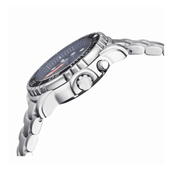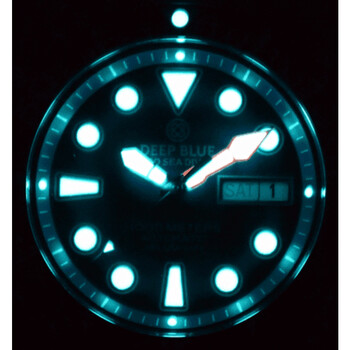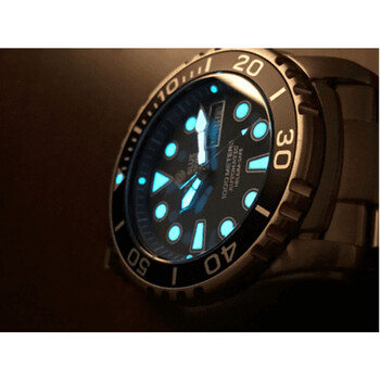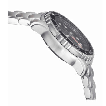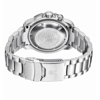 Stainless steel case with a stainless steel bracelet. Uni-directional rotating stainless steel bezel with an inlaid black aluminium ring. Blue dial with luminous silver-tone hands and dot hour markers. Minute markers around the outer rim. Dial Type: Analog. Luminescent hands and markers. Day of the week and date display at the 3 o'clock position. Seiko caliber NH36 automatic movement, containing 24 Jewels, bitting at 21600 vph, and has a power reserve of approximately 41 hours. Scratch resistant sapphire crystal. Screw down crown. Solid case back. Round case shape. Case size: 45 mm. Case thickness: 15 mm. Band width: 24 mm. Band length: 8.5 inches. Deployment with push button release clasp. Water resistant at 1000 meters / 3300 feet. Functions: date, day, hour, minute, second. Additional Info: unique black bezel dark blue dial oyster bracelet. Pro Sea Diver 1000 Series. Dive watch style. Watch label: Japan Movt. Deep Blue Pro Sea Diver 1000 Automatic Blue Dial Men's Watch PSD1KDARKBLUE.