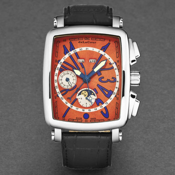 Silver-tone stainless steel case with a black leather strap. Fixed silver-tone stainless steel bezel. Orange dial with blue hands and Arabic numeral hour markers. Minute markers around the outer rim. Dial Type: Analog. Luminescent hands and markers. Day / date / month. Three sub-dials displaying: 24 hour, 30 minute and 1/10th of a second/moonphase. ETA-Valjoux Caliber 7751 Automatic movement, based upon ETA 7750, containing 25 Jewels, bitting at 28800 vph, and has a power reserve of approximately 44 hours. Scratch resistant sapphire crystal. Pull / push crown. Transparent case back. Rectangle case shape, case size: 38 mm, case thickness: 15 mm. Band width: 22 mm, band length: 8 inches. Tang clasp. Water resistant at 30 meters / 100 feet. Functions: full calendar, moon phase, chronograph, month, date, day, GMT, second time zone, hour, minute, small second, day/night indicator. Additional Info: hours, minutes, small seconds, day, date, month, moonphase, chronograph, 24 hour indicator. Vialarga Series. Luxury watch style. DeLaCour Vialarga Chronograph GMT Automatic Moon Phase Day-Night Orange Dial Men's Watch WAST1026-ORG.