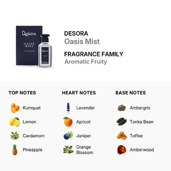 Embrace the essence of Oasis Mist and let its aromatic fruity charm envelop you, as Desora invites you to redefine sophistication and elegance. Perfect for any occasion, this fragrance is more than just a scent—it's a statement.