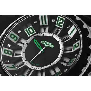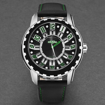 Titanium case with a black leather strap. Fixed black titanium bezel. Black dial with green hands and Arabic numeral hour markers. Minute scale around the inner rim. Dial Type: Analog. Automatic movement. Scratch resistant sapphire crystal. Pull / push crown. Transparent case back. Round case shape, case size: 49.2 mm, case thickness: 15.3 mm. Band width: 23 mm, band length: 8 inches. Fold over clasp. Water resistant at 30 meters / 100 feet. Functions: hour, minute, second. Additional Info: 3D hours, minutes, seconds. Academia Series. Luxury watch style. DeWitt Academia Automatic Black Dial Men's Watch AC.SLD.002 RPB.