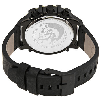 Black-plated stainless steel case with a black leather strap. Fixed black-plated bezel. Black dial with luminous black hands and index hour markers. Minute markers around the outer rim. Dial Type: digital. Luminescent hands and markers. Date display at the 9 o'clock position. Chronograph - three sub-dials displaying: 60 second, 30 minute and 24 hour. Quartz movement. Scratch resistant mineral crystal. Pull / push crown. Solid case back. Round case shape. Case size: 48 mm. Case thickness: 13 mm. Band width: 22 mm. Tang clasp. Water resistant at 50 meters / 165 feet. Functions: chronograph, date, hour, minute, second. Griffed Series. Sport watch style. Diesel Chronograph Quartz Digital Black Dial Men's Watch DZ4519.