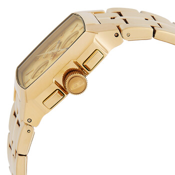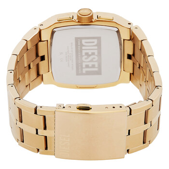 Gold-tone stainless steel case and bracelet. Fixed gold-tone stainless steel bezel. Gold dial with gold-tone hands and index-Arabic numeral hour markers. Minute markers around the outer rim. Dial Type: Analog. Date display at the 4 o'clock position. Chronograph - three sub-dials displaying: 60 second, 30 minute and 24 hour. Quartz movement. Scratch resistant mineral crystal. Solid case back. Square case shape, case size: 40 mm. Fold over clasp with a safety release. Water resistant at 100 meters / 330 feet. Functions: chronograph, date, hour, minute, second. Cliffhanger Series. Sport watch style. Diesel Cliffhanger Chronograph Quartz Gold Dial Men's Watch DZ4639.