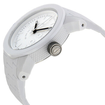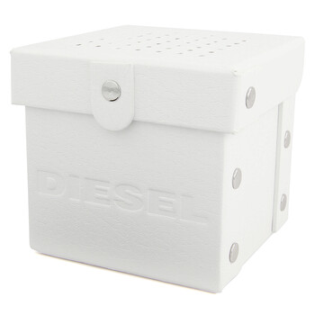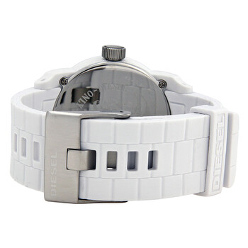 White silicone-covered stainless steel case with a white rubber strap. Fixed white silicone-covered bezel. White dial with luminous black hands and index hour markers. Arabic numerals mark the 2, 3 and 4 o'clock positions. Minute markers around the outer rim. Dial Type: Analog. Quartz movement. Scratch resistant mineral crystal. Pull / push crown. Solid case back. Case diameter: 44 mm. Round case shape. Band width: 24 mm. Band length: 8.5 inches. Tang clasp. Water resistant at 50 meters/ 165 feet. Functions: hour, minute, second. Casual watch style. Diesel Double Down White Rubber Men's Watch DZ1436.