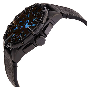 Black stainless steel case with a black leather strap. Fixed black stainless steel bezel. Black dial with black hands and index hour markers. Minute markers around the outer rim. Dial Type: Analog. Chronograph - three sub-dials displaying: 60 second, 60 minute and 1/10th of a second. Quartz movement. Scratch resistant mineral crystal. Pull / push crown. Round case shape, case size: 44 mm, case thickness: 13 mm. Buckle clasp. Water resistant at 50 meters / 165 feet. Functions: chronograph, hour, minute, second. Framed Series. Sport watch style. Diesel Framed Chronograph Quartz Black Dial Men's Watch DZ4658.