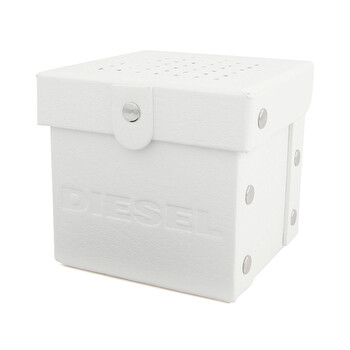 Gold-plated stainless steel case with a black leather strap. Uni-directional rotating gold-plated bezel. Black dial with luminous gold-tone hands and index hour markers. An Arabic numeral appears at the 12 o'clock position. Minute markers around the outer rim. Dial Type: Analog. Luminescent hands and markers. Date display at the 3 o'clock position. Chronograph - three sub-dials displaying: 60 second, 60 minute and 1/10th of a second. Quartz movement. Scratch resistant mineral crystal. Solid case back. Case dimensions: 51 mm x 59 mm. Case thickness: 12 mm. Round case shape. Band width: 26 mm. Tang clasp. Water resistant at 100 meters / 330 feet. Functions: chronograph, date, hour, minute, second. Dress watch style. Diesel Mega Chief Black Dial Black Leather Men's Watch DZ4344.