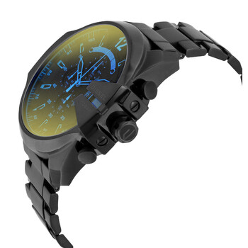 Black ion-plated stainless steel case and bracelet. Fixed black ion-plated bezel. Brown dial with skeleton hands and index hour markers. An Arabic numeral minute markers (at 5 minute intervals). Minute markers around the outer rim. Dial Type: Analog. Luminescent hands and markers. Chronograph - three sub-dials displaying: 60 second, 60 minute and 1/10th of a second. Quartz movement. Scratch resistant iridescent mineral crystal. Solid case back. Round case shape. Case dimensions: 59 mm x 51 mm. Case thickness: 12 mm. Band width: 26 mm. Deployment clasp. Water resistant at 100 meters / 330 feet. Functions: hour, minute, second, date, chronograph. Mega Chief Series. Dress watch style. Diesel Mega Chief Black Ion-plated Stainless Steel Men's Watch DZ4318.