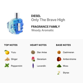 Only The Brave High belongs to the Woody Aromatic fragrance family, offering a crisp and refreshing experience from the very first spray. It opens with an invigorating burst of yuzu, ginger, and peppermint—an energetic trio that awakens the senses. The heart of the scent features the aromatic blend of star anise, geranium, and lavandin, adding a touch of sophistication and warmth. Finally, powerful base notes of cashmeran, amberxtreme, moss, and styrax leave a lasting impression that’s both earthy and magnetic.