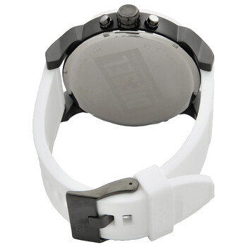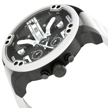 Gunmetal stainless steel case with a white silicone strap. Fixed white stainless steel bezel. Black dial with silver-tone hands. Dial Type: Analog. Quartz movement. Scratch resistant mineral crystal. Solid case back. Round case shape, case size: 57 mm. Band width: 28 mm. Buckle clasp. Water resistant at 30 meters / 100 feet. Functions: chronograph, date, hour, minute, second. Mr. Daddy 2.0 Series. Sport watch style. Diesel Mr. Daddy 2.0 Chronograph Quartz Black Dial Men's Watch DZ7478.