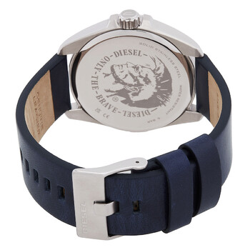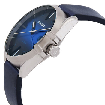 Silver-tone stainless steel case with a blue leather strap. Fixed silver-tone stainless steel bezel. Blue dial with black hands and index hour markers. Arabic numeral minute markers (at 5 minute intervals). Dial Type: Analog. Date display at the 3 o'clock position. Quartz movement. Scratch resistant mineral crystal. Pull / push crown. Solid case back. Round case shape, case size: 44 mm. Buckle clasp. Water resistant at 50 meters / 165 feet. Functions: date, hour, minute, second. Ms9 Series. Casual watch style. Diesel MS9 Quartz Blue Dial Men's Watch DZ1991.