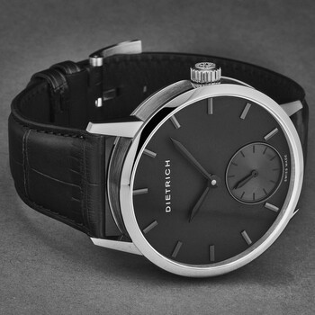 Silver-tone stainless steel case with a black leather strap. Fixed silver-tone stainless steel bezel. Black dial with black hands and index hour markers. Dial Type: Analog. One subdial displaying: small second. ETA Caliber 6498-1 Hand Wind movement, containing 17 Jewels, bitting at 19800 vph, and has a power reserve of approximately 46 hours. Scratch resistant sapphire crystal. Pull / push crown. Transparent case back. Round case shape, case size: 43 mm, case thickness: 10.6 mm. Band width: 23 mm, band length: 8 inches. Tang clasp. Water resistant at 30 meters / 100 feet. Functions: hour, minute, small second. Additional Info: hours, minutes, small seconds. Night Series. Luxury watch style. Watch label: Swiss Movt. Dietrich Night Hand Wind Black Dial Men's Watch NB ALL BLKSS.