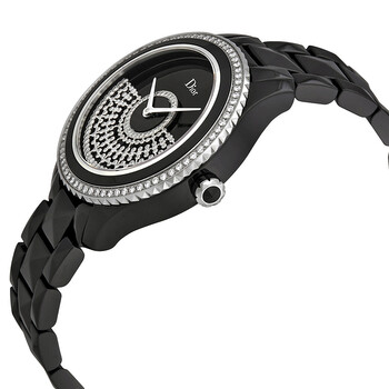 Black ceramic case with a black ceramic bracelet. Fixed stainless steel bezel with a black ceramic inlay set with diamonds. Black mother of pearl (diamond-set) dial with silver-tone hands. No markers. Dial Type: Analog. Automatic movement. Scratch resistant sapphire crystal. Pull / push crown. Transparent case back. Round case shape. Case size: 38 mm. Case thickness: 12.5 mm. Band width: 18 mm. Fold over clasp. Water resistant at 50 meters / 165 feet. Functions: hour, minute. VIII Grand Bal Broderie Series. Luxury watch style. Watch label: Swiss Made. Dior Dior VIII Grand Ba Automatic Ladies Watch CD124BE3C001.