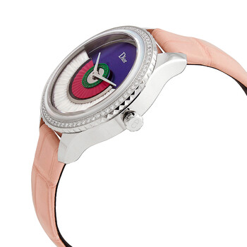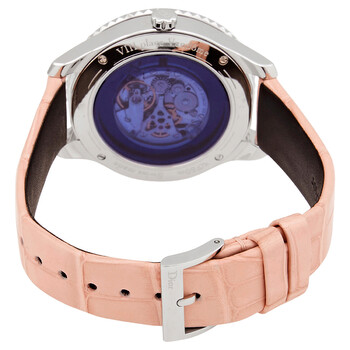 Stainless steel case with a matt powder pink (alligator) leather strap. Fixed stainless steel bezel set with diamonds. Translucent blue lacquer (coquette oscillating weight) dial with silver-tone hands. No markers. Dial Type: Analog. Automatic movement. Scratch resistant sapphire crystal. Pull / push crown. Transparent case back. Round case shape. Case size: 36 mm. Case thickness: 11.5 mm. Tang clasp. Water resistant at 50 meters / 165 feet. Functions: hour, minute. Grand Bal Coquette Series. Luxury watch style. Watch label: Swiss Made. Dior Grand Bal Coquette Automatic Ladies Watch CD153B13A001.