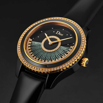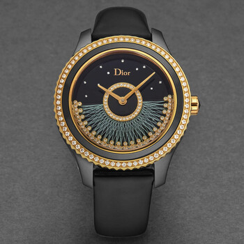 Rose gold-tone ceramic, rose gold / pink gold case with a black leather strap. Rose gold-tone 18kt rose gold with diamonds bezel. Black dial set with diamonds & rose gold and green accents dial with rose gold-tone hands. Dial Type: Analog. Automatic movement with a 42-hour power reserve. Scratch resistant sapphire crystal. Transparent see through case back. Round case shape, case size: 38 mm. Tang clasp. Water resistant at 50 meters / 165 feet. Functions: hour, minute, second. Dress watch style. Watch label: Swiss Made. Dior Automatic Diamond Ladies Watch CD124BH4A002.