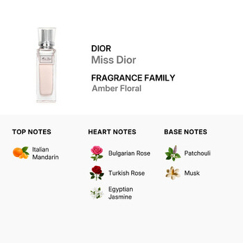 Miss Dior belongs to the Amber Floral fragrance family, offering a captivating scent journey that begins with a burst of zesty Italian Mandarin. At its heart, a bouquet of rich Bulgarian and Turkish roses blends beautifully with sensual Egyptian Jasmine, creating a floral core that is both romantic and radiant. The fragrance finishes with warm, earthy notes of Patchouli and Musk, leaving a lasting impression of grace and charm.