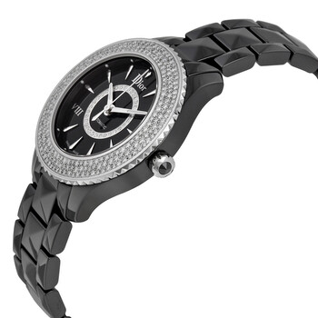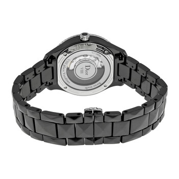 Black ceramic and stainless steel case with a black ceramic bracelet. Uni-directional rotating bezel set with diamonds bezel. Black with diamonds dial with silver-tone hands and stick hour markers. Dial Type: Analog. Luminescent hands. Automatic movement. Scratch resistant sapphire crystal. Skeleton case back. Case diameter: 33 mm. Round case shape. Deployment with push button clasp. Water resistant at 50 meters / 165 feet. Functions: hour, minute, second. Luxury watch style. Watch label: Swiss Made. Dior VIII Automatic Diamond Black Ceramic 33 mm Ladies Watch CD1235E1C001.