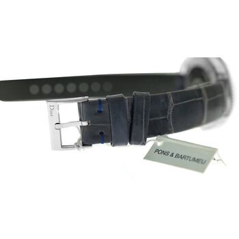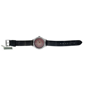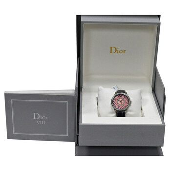 Silver-tone stainless steel case with a black leather strap. Fixed silver-tone bezel with diamond set stainless steel. Pink dial with silver-tone hands. Dial Type: Analog. Quartz movement. Solid case back. Round case shape, case size: 32 mm. Band length: 6.75 inches. Buckle clasp. Functions: hour, minute, second. Viii Montaigne Series. Luxury watch style. Watch label: Swiss Made. Item Variations: CD152113. Dior VIII Montaigne Quartz Diamond Pink Dial Ladies Watch CD152113A001.