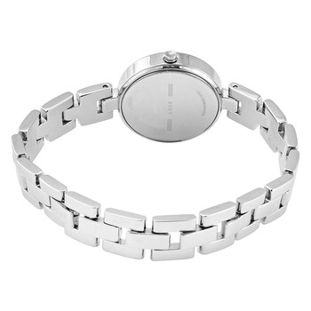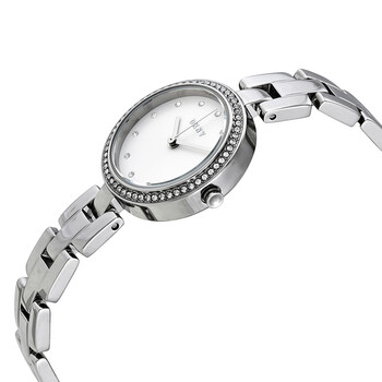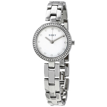 Stainless steel case with a stainless steel bracelet. Fixed stainless steel bezel set with crystals. Silver-tone dial with silver-tone hands and crystal hour markers. Dial Type: Analog. Quartz movement. Scratch resistant mineral crystal. Pull / push crown. Solid case back. Round case shape. Case size: 26 mm. Case thickness: 7 mm. Band width: 10 mm. Adjust-o-matic clasp. Water resistant at 50 meters / 165 feet. Functions: hour, minute, second. Dress watch style. Watch label: Japan Movt. DKNY City Link Quartz Crystal Silver Dial Ladies Watch NY2824.